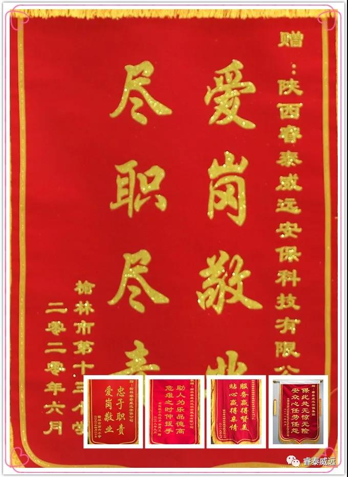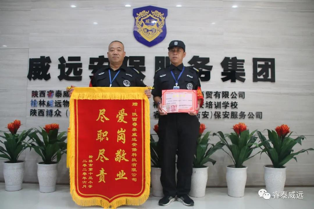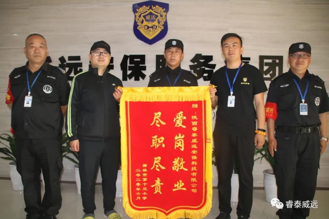 公司新聞2020年6月9日上午,榆林市第十三小學(xué)校方領(lǐng)導(dǎo)親自將一面繡著“愛崗敬業(yè) 盡職盡責(zé)”贊語的錦旗贈(zèng)送于陜西睿泰威遠(yuǎn)安??萍加邢薰荆瑢?duì)該駐點(diǎn)派遣的保安員高度的責(zé)任心、盡忠職守的工作態(tài)度給予了贊揚(yáng),以薛軍和同志為學(xué)習(xí)榜樣,并對(duì)保安員們?cè)谝咔槠陂g對(duì)保衛(wèi)學(xué)校安全,維護(hù)學(xué)校秩序做出的貢獻(xiàn)表示感謝。